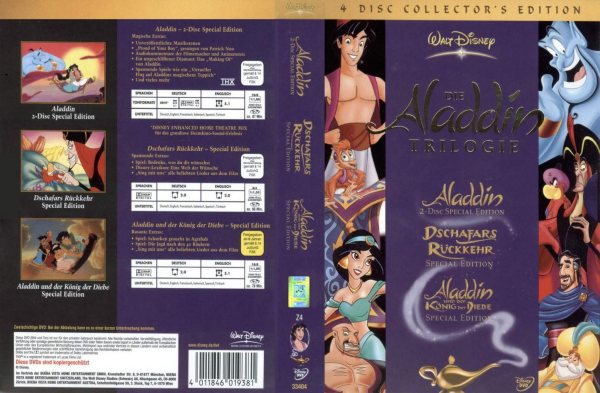 Aladdin Nichts macht Aladdin lieber, als über Dächer zu springen und gemeinsam mit seinem lustigen Äffchen Abu griesgrämige Händler auszutricksen. Er kennt die Gassen der Basare wie seine Westentasche und trotzdem träumt er von einem anderen Leben, seit er Jasmin, die Tochter des Sultans kennen gelernt hat. Eines Tages ändert sich Aladdins Leben schlagartig, denn er gelangt in den Besitz einer Wunderlampe und die hat es wirklich in sich: einen gigantischen, unendlich ausgeflippten Flaschengeist namens Dschinni, der seinem Besitzer drei Wünsche erfüllen kann. Aber auch der hinterhältige Großwesir Dschafar kennt die Macht der Lampe und will mit ihrer Hilfe seine finsteren Pläne verwirklichen. Ein rasantes Wettrennen beginnt... Dschafars Rückkehr Alle dachten, der hinterhältige Zauberer Dschafar wäre für immer sicher in der Wunderlampe eingesperrt. Doch er kann sich befreien und versucht mit seinen kosmischen Kräften das Königreich zu erobern. Doch Aladdin und Prinzessin Jasmin setzen alles daran dem bösen Zauberer an seinen Plänen zu hindern. Mit Hilfe des super-witzigen Flaschengeistes Dschinni ist so manch eine überraschende Wendung vorprogrammiert... Aladdin Und Der König Der Diebe Ganz Agrabah ist wegen der bevorstehenden Hochzeit des Jahrhunderts in heller Aufregung. Doch bevor sich Aladdin und Jasmin das Ja-Wort geben können, unterbricht Cassim mit seinen vierzig Räubern die Zeremonie. Er ist auf der Suche nach der Hand des Midas - einem Schatz, der alles, was er berührt, in Gold verwandelt. Begleitet von Dschinni, dem witzigsten aller Lampengeister, begibt sich Aladdin auf die Suche nach den Räubern. Diese aufregende Reise rettet nicht nur die Hochzeit, sondern bringt Aladdin auch auf die Spur seines lange verschollen geglaubten Vaters.... Atemberaubende Spannung, jede Menge Spaß und ein Schuß Romantik sowie fünf neue Songs machen "Aladdin und der König der Diebe" zu einem absoluten Muß für alle Disney-Fans. | |||||||||||||||||||||||||||||||||||||||||||||||||||||||||||