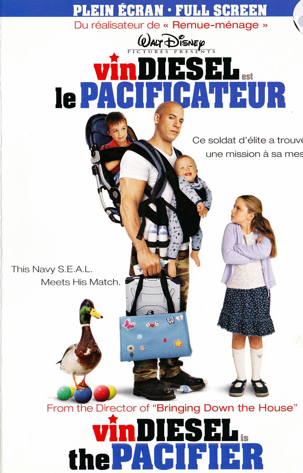 | « Le meilleur de tous les films de Vin Diesel ! » — Jim Svejda, KNX/CBS Radio "Vin Diesel's Best Movie Ever!" — Jim Svejda, KNX/CBS Radio Walt Disney Pictures présente le h eros d'actrion Vin Diesel (XXX, Rapides et dangereux) dans un comédie au rythme endiablé du réalisateur de Remue-Ménage ! Le lieutenant Shane Wolfe (Diesel), un dur à cuire des S.E.A.L. de la marine américaine, a dirigé des opérations militaires aux quatre coins du globe. Mais sa nouvelle mission, qui le ramène aux États-Unis, mettra à l'épreuve tout son savoir-faire : il doit protéger une maison où vivent cinq enfants incontrôlables! Délaissant son matériel de combat pour le sac à couches et les berlingots de jus, il s'embarque pour un boulot de baby-sitter... et découvre l'aventure avec un grand A ! Armé d'un humour dévastateur et d'une tonne de suppléments épatants, ce DVD est idéal pour toute la famille! Walt Disney Pictures presents action hero Vin Diesel (XXX, The Fast And The Furious) in a fast-paced comedy from the director of Bringing Down The House! Lt. Shane Wolfe (Diesel) is a tough-as-nails Navy S.E.A.L. who has controlled military operations in every corner of the globe. Now the ultimate test comes when he's assigned to protect the home front...as in a house loaded with five out-of-control kids! But even when he trades combat gear for diapers and juice boxes, it's not just a babysitting job...it's an adventure! Armed with hilarious laughs and tons of great bonus features, it's the perfect DVD for the whole family to enjoy! "Fun For All Ages!" — Jim Ferguson, ABC-TV, Tucson « Drôle pour tous les âges ! » — Jim Ferguson, ABC-TV, Tucson | |||||||||||||||||||||||||||||||||||||||||||||||||||||||