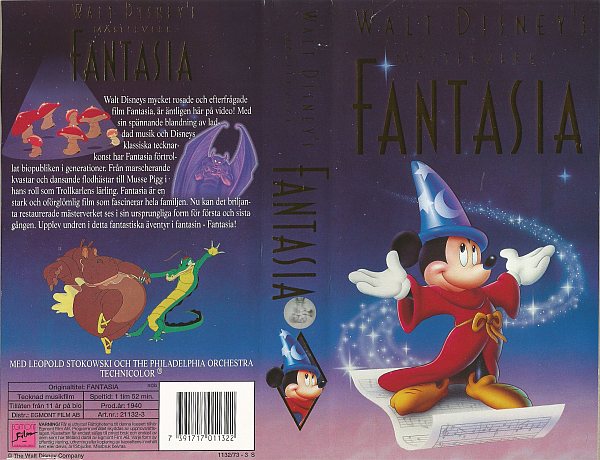 | Walt Disneys mycket rosande och efterfrågade film Fantasia, är äntligen här på video! Med sin spännande blandning av laddad musik och Disneys klassiska tecknarkonst har Fantasia förtrollat biopubliken i generationer. Från marscherande kvastar och dansande flodhästar till Musse Pigg i hans roll som Trollkarlens lärling. Fantasia är en stark och oförglömlig film som fascinerar hela familjen. Nu kan det briljanta restaurerade mästerverket ses i sin ursprungliga form för första och sista gången. Upplev undren i detta fantastiska äventyr i Fantasin - Fantasia! | |||||||||||||||||||||||||||||||||||||||||||