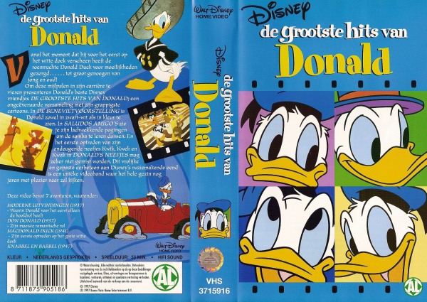 | Vanaf het moment dat hij voor het eerst op het witte doek verscheen heeft de roemruchte Donald Duck voor moeilijkheden gezorgd.......tot groot genoegen van jong en oud! Om deze mijlpalen in zijn carrière te vieren presenteren Donald's beste Disney vriendjes DE GROOTSTE HITS VAN DONALD; een ongeëvenaarde verzameling met zijn grappigste cartoons. In DE BENEVIETVOORSTELLING is Donald zowel in zwart-wit als in kleur te zien. In SALUDOS AMIGO'S zie je zijn lachwekkende pogingen om de samba te leren dansen. En het eerste optreden van zijn ondeugende neefjes Kwik, Kwek en Kwak in DONALD'S NEEFJES mag zeker niet gemist worden. Dit vrolijke en gepaste eerbetoon aan Disney's ruziemakende eend is een unieke videoband waar het hele gezin nog jaren met plezier naar zal kijken. Deze video bevat 7 avonturen, waaronder: MODERNE UITVINDINGEN (1937) - Waarin Donald voor het eerst alleen de hoofdrol heeft DON DONALD (1937) - Zijn mooiste romantische rol MACDONALD DUCK (1941) - Zijn eerste optreden op het grote witte doek KNABBEL EN BABBEL (1947) | |||||||||||||||||||||||||||||||||||||||